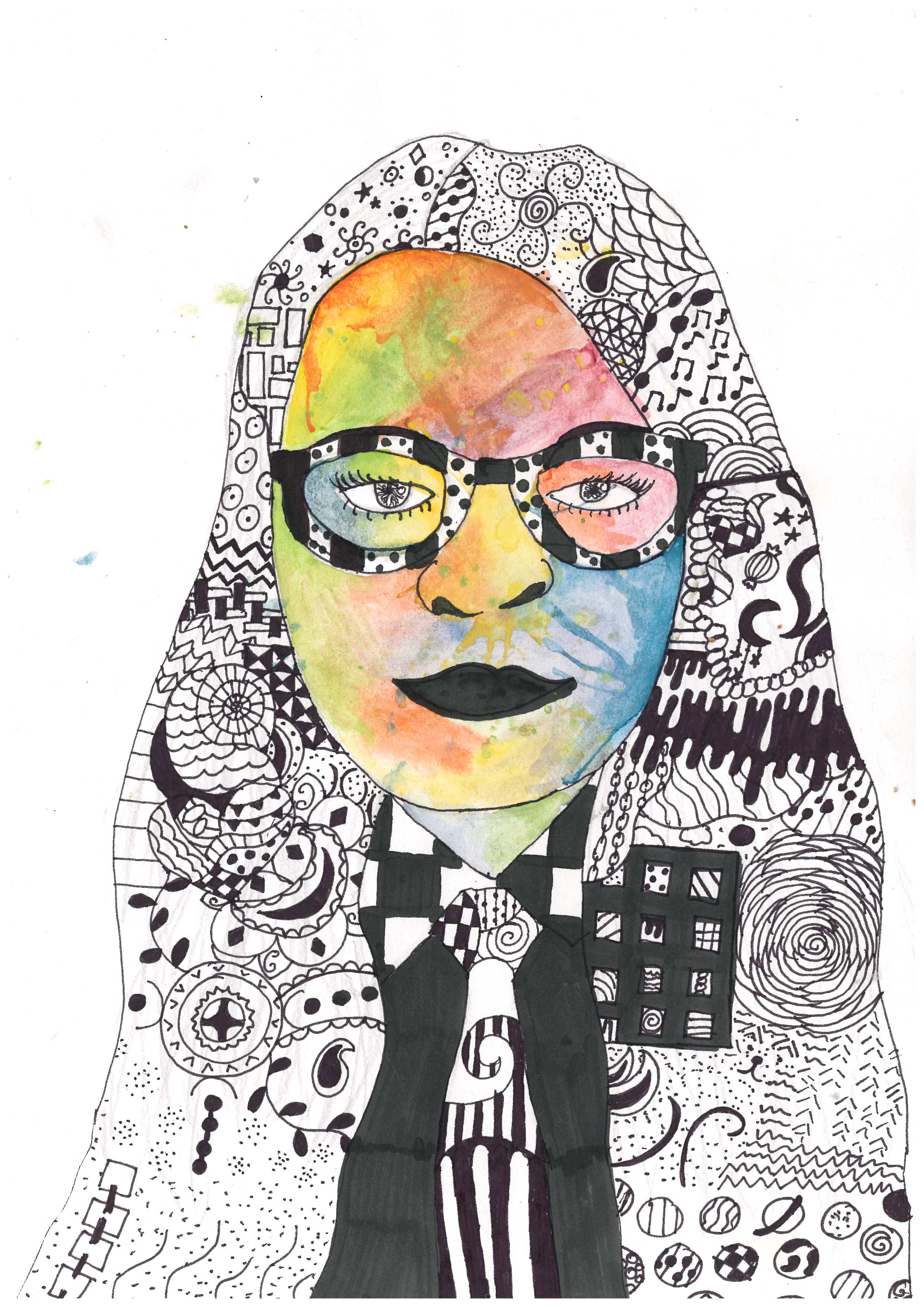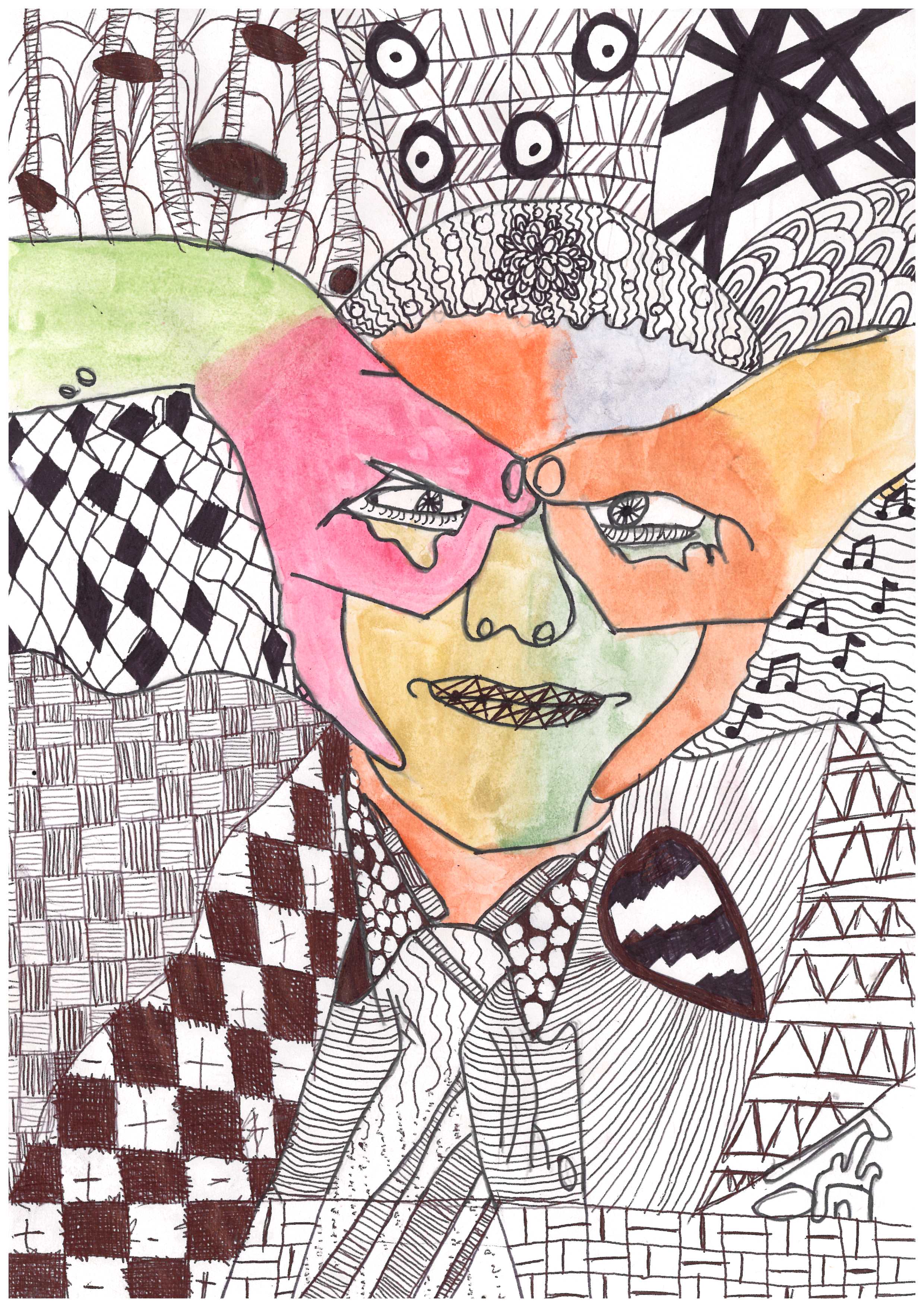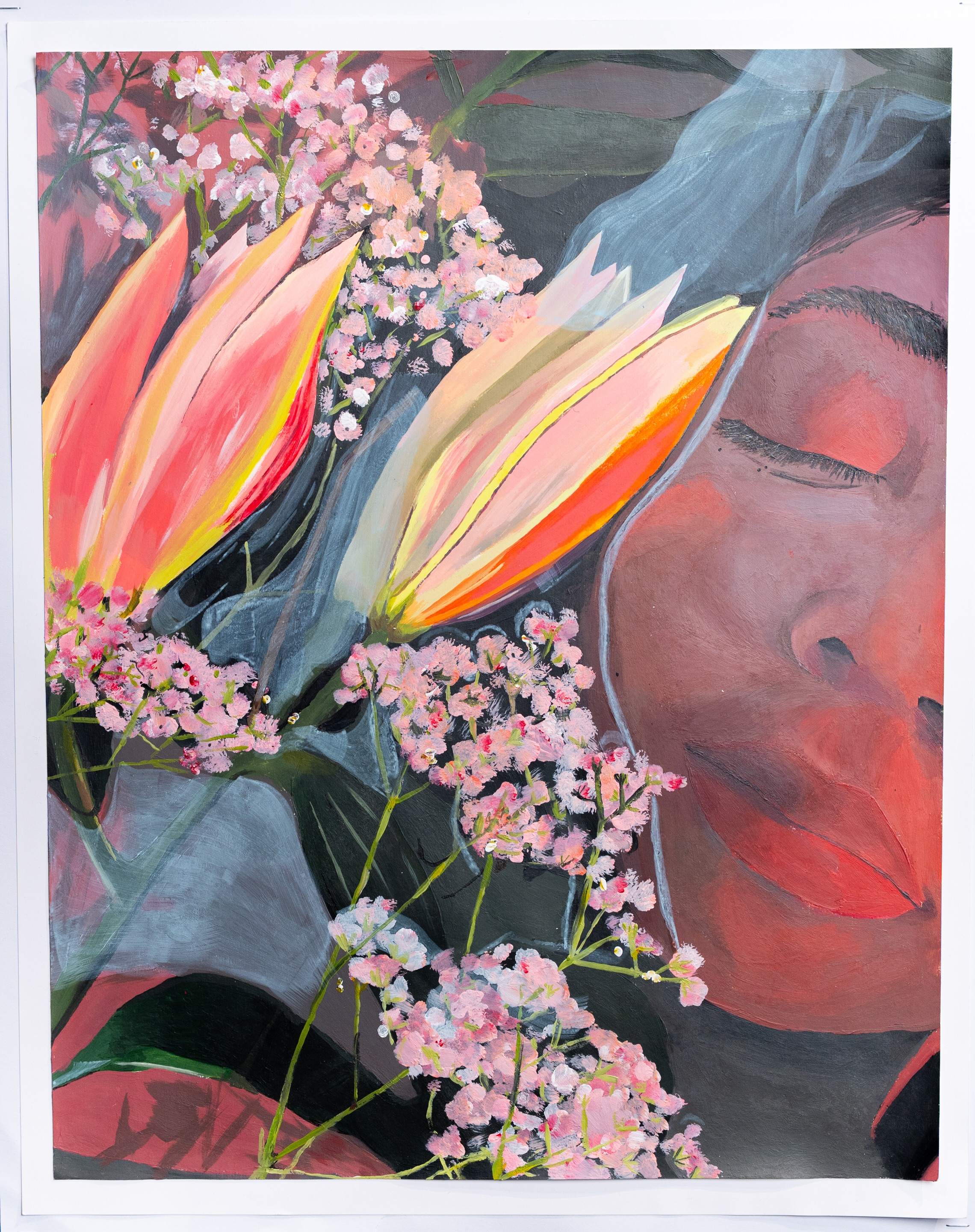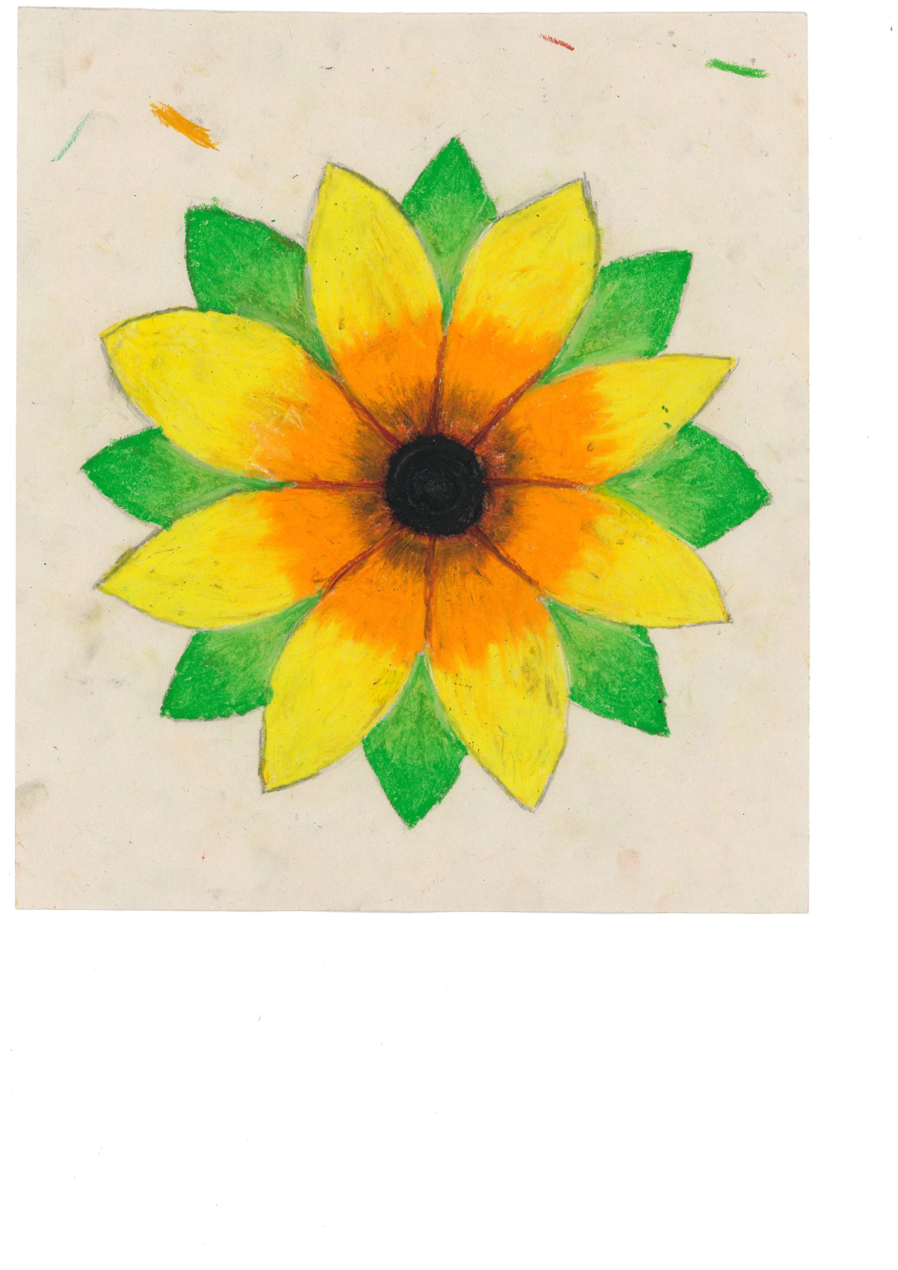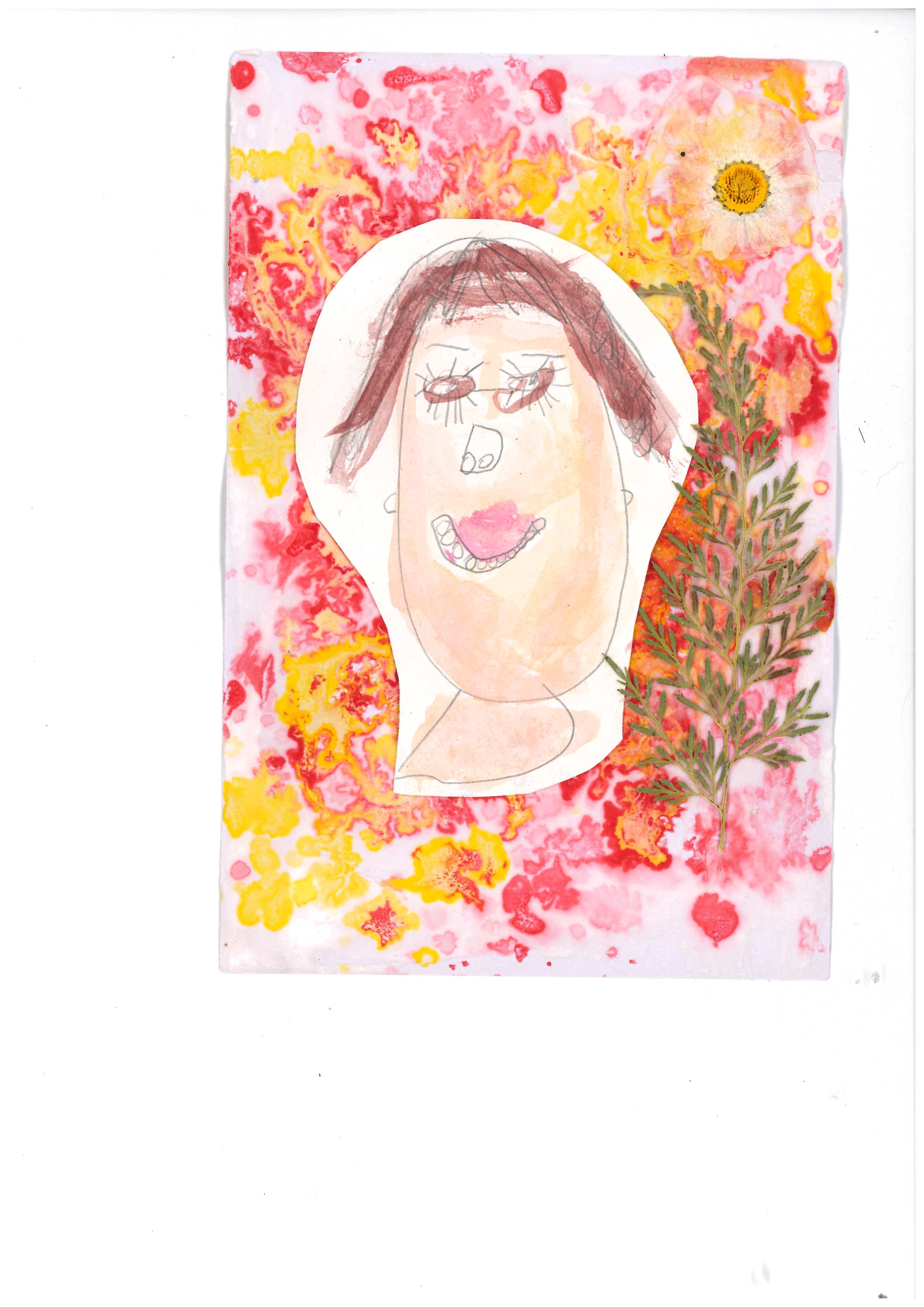 The positioning of facial features is engaging and interesting, as is the placement of the flower next to the head.