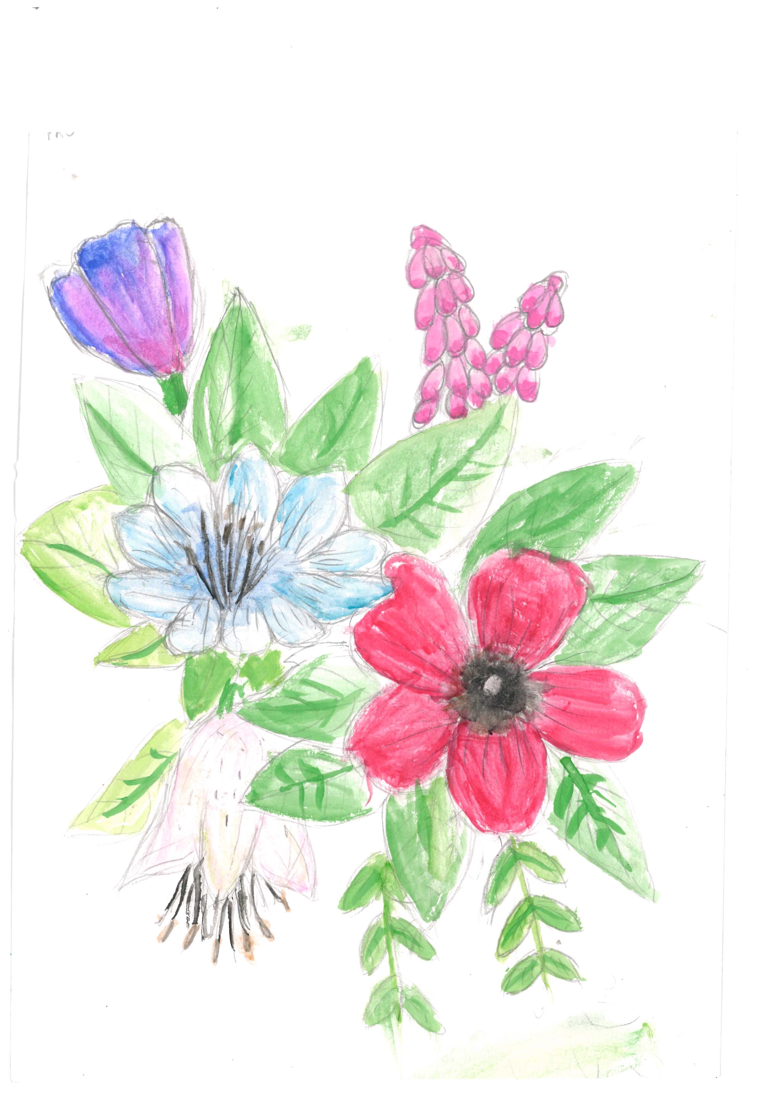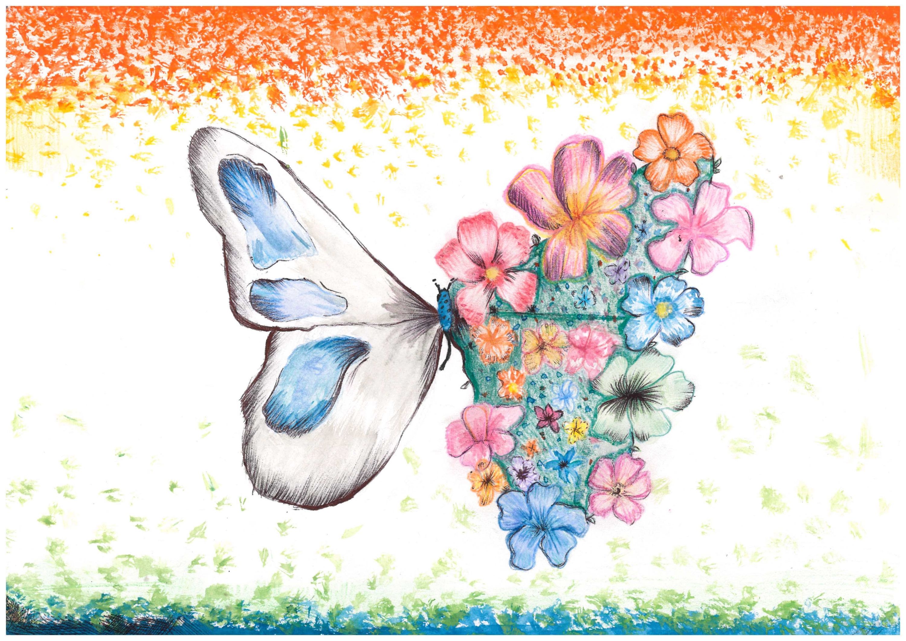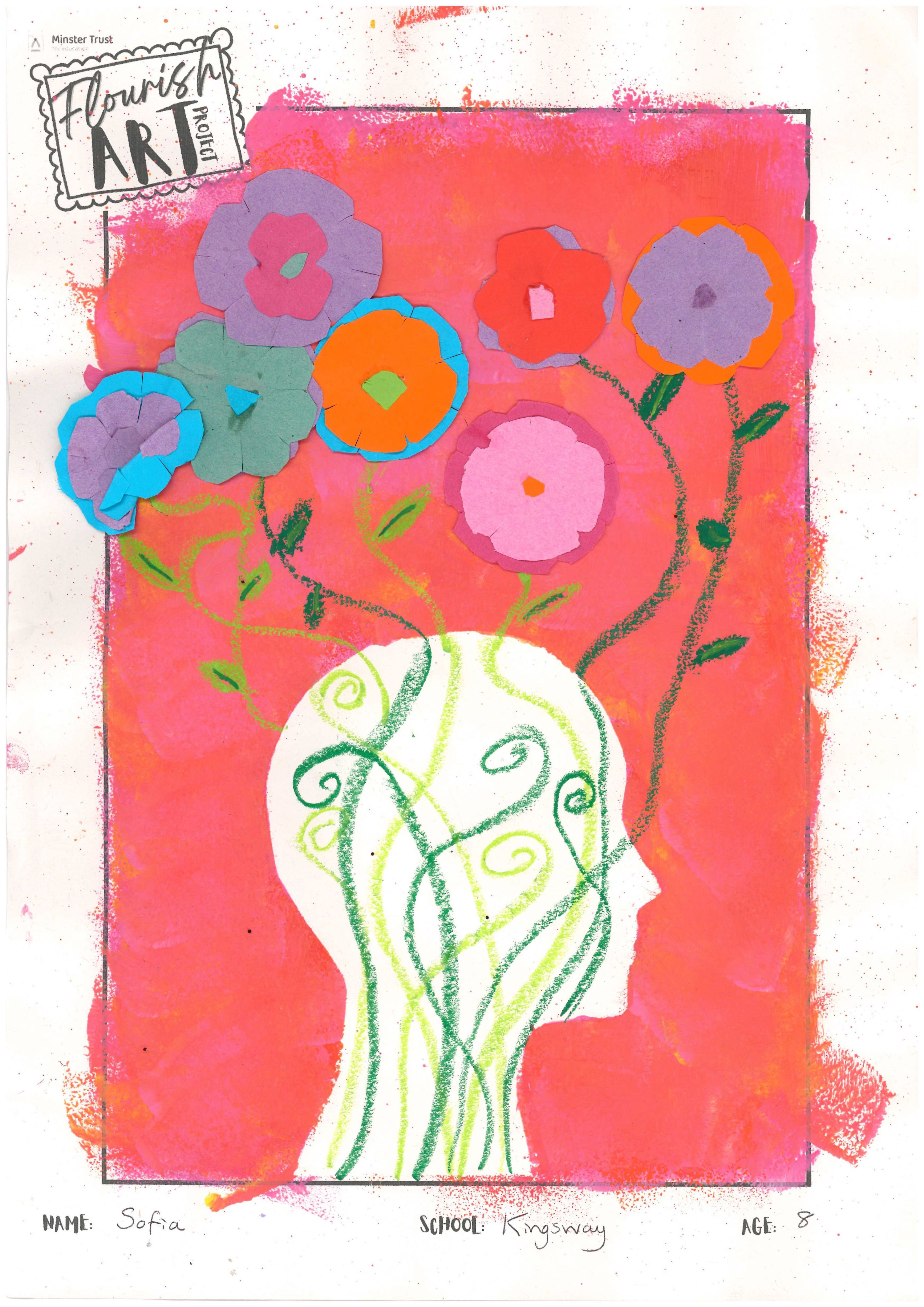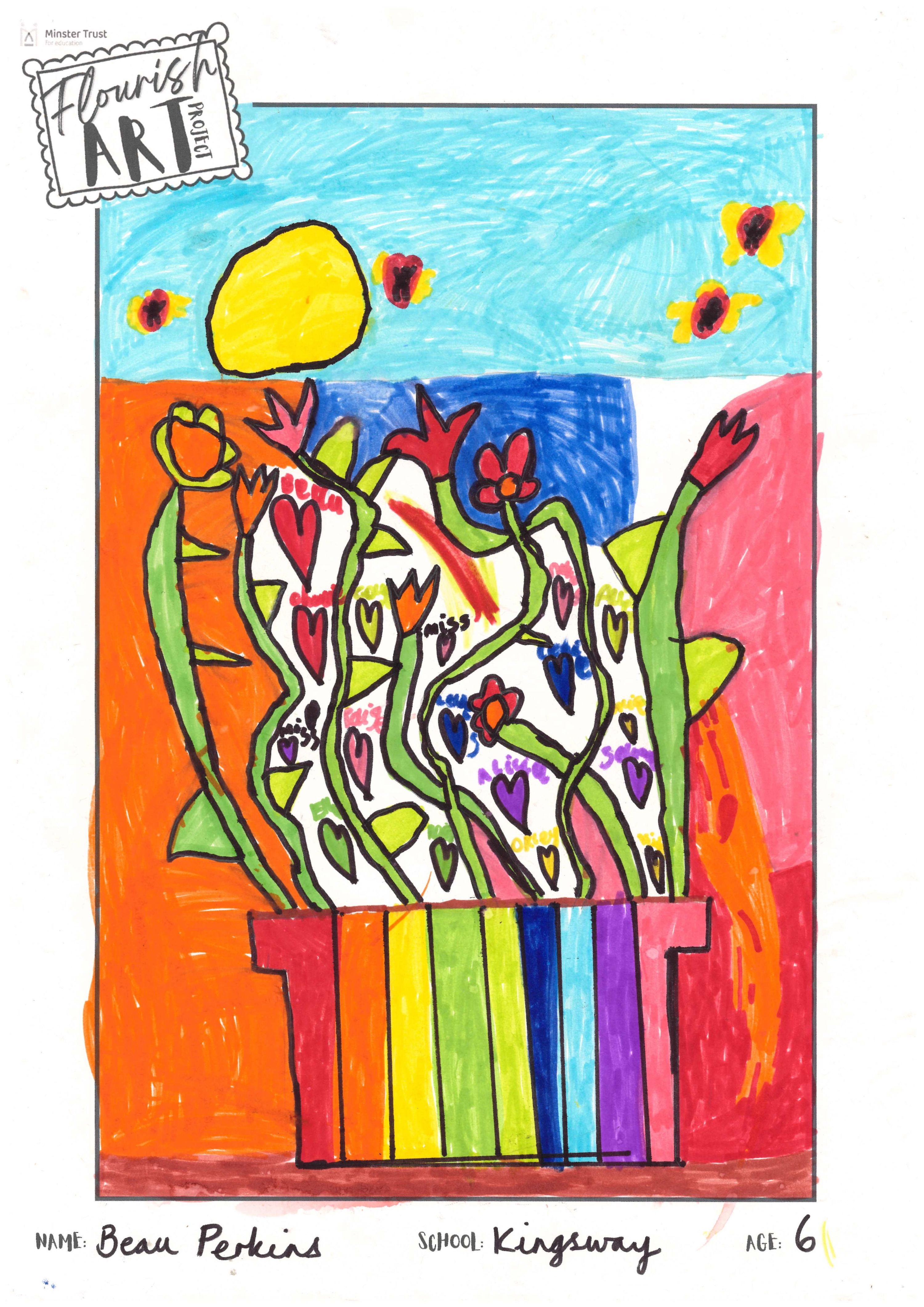 This is a vibrant piece demonstrating a controlled use of colour, texture and composition. The theme is represented in a striking way and the flowers are drawn with technical precision.