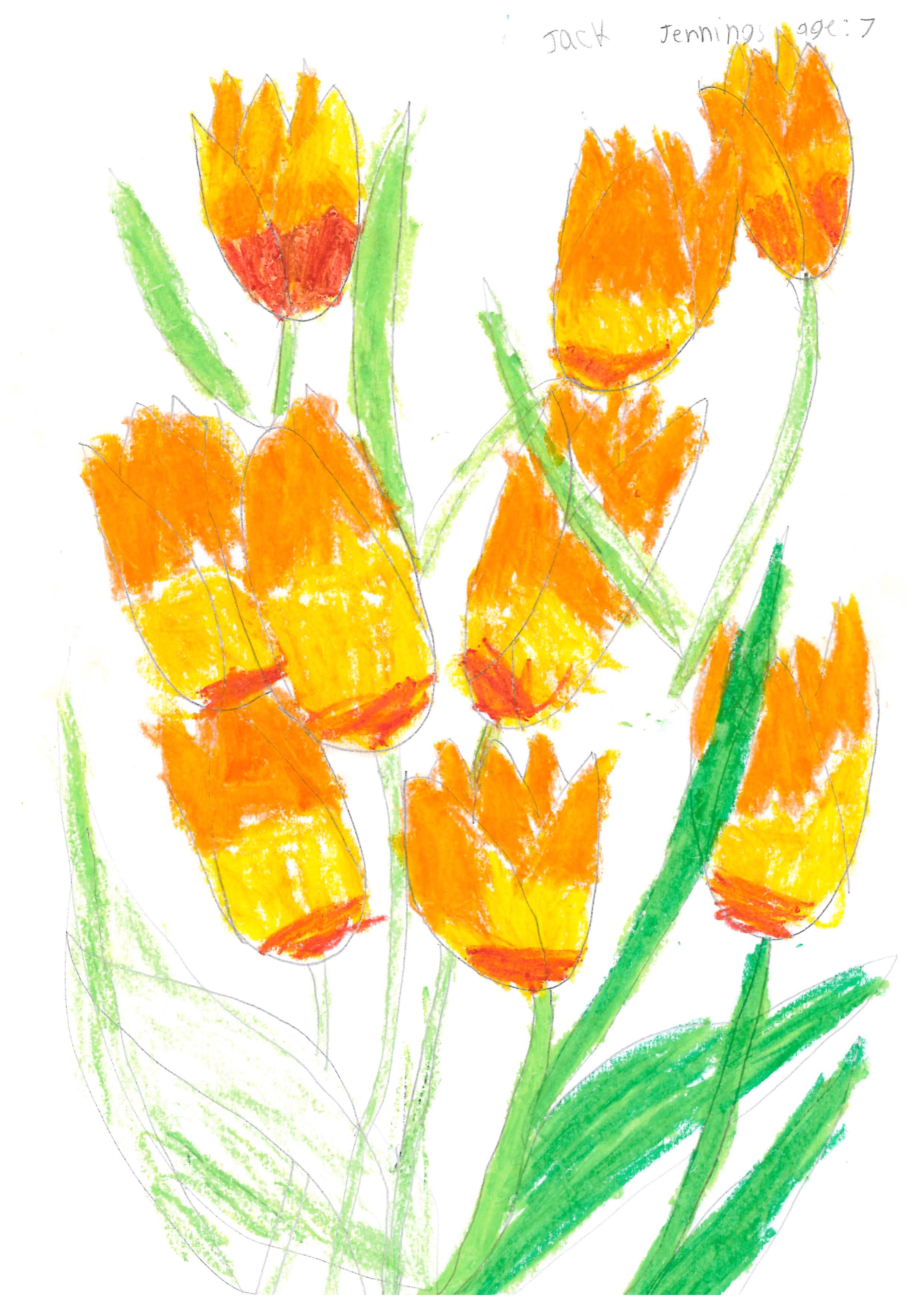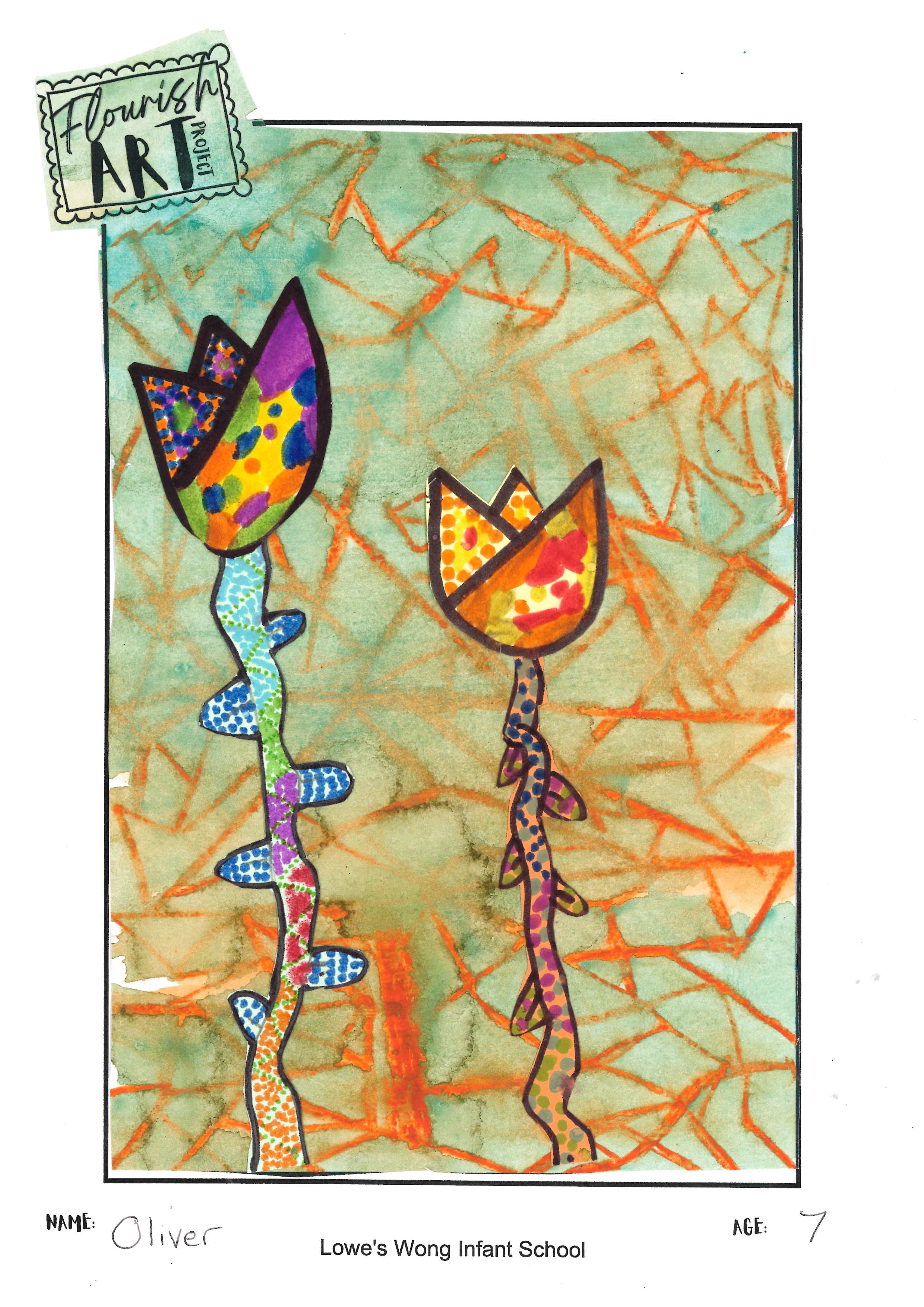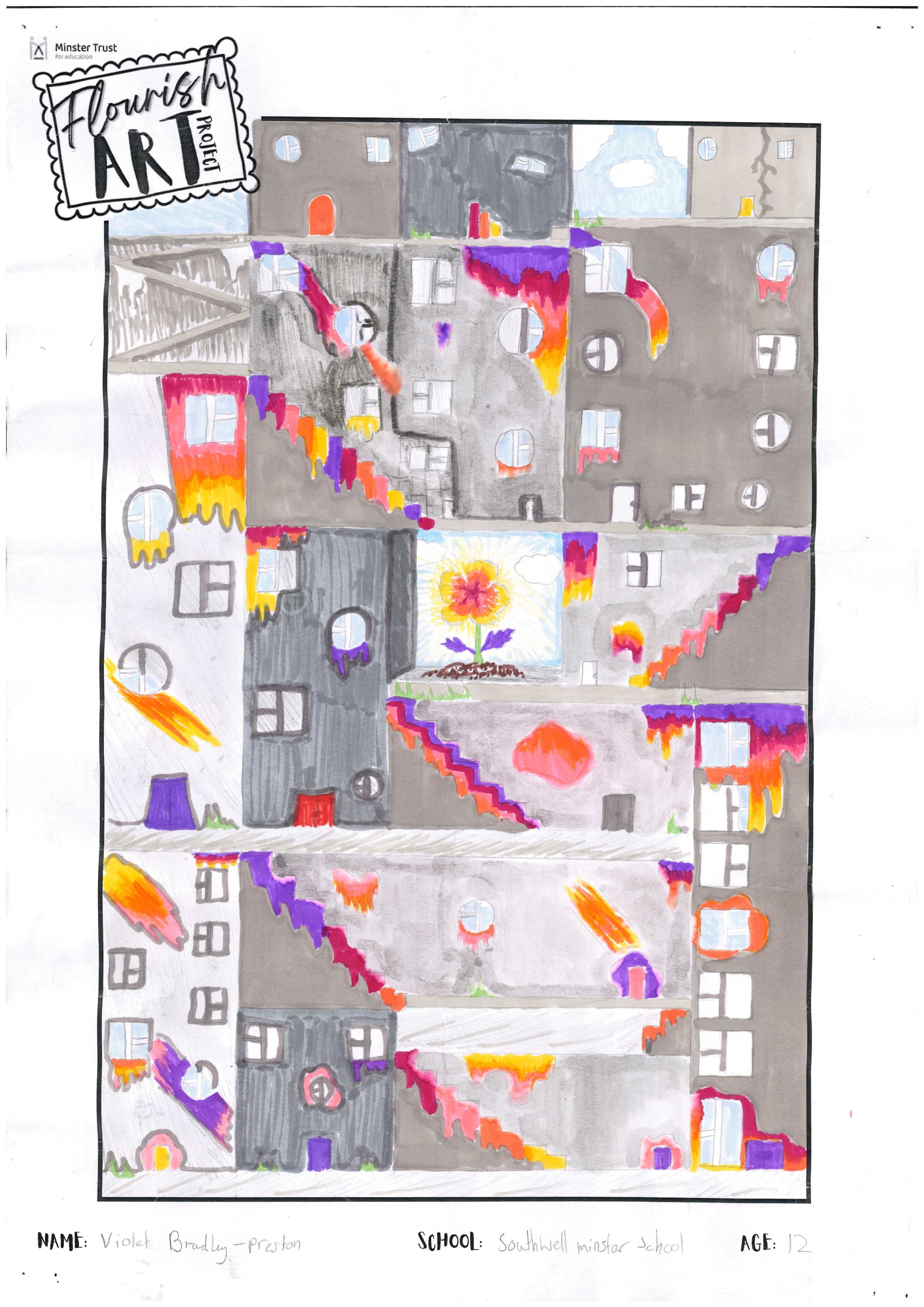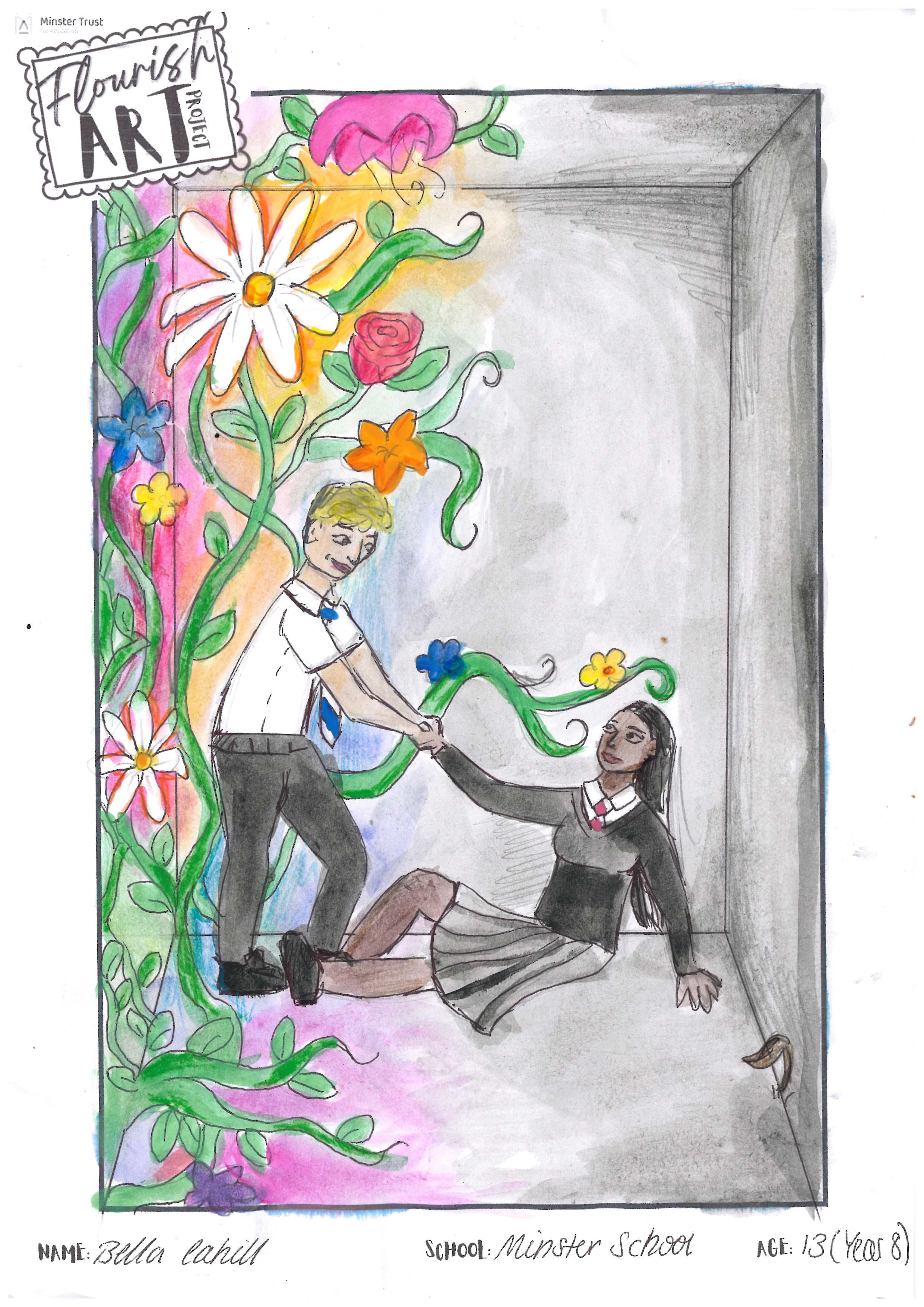 This is a vibrant piece demonstrating a controlled use of colour, texture and composition. The theme is represented in a striking way and the flowers are drawn with technical precision.