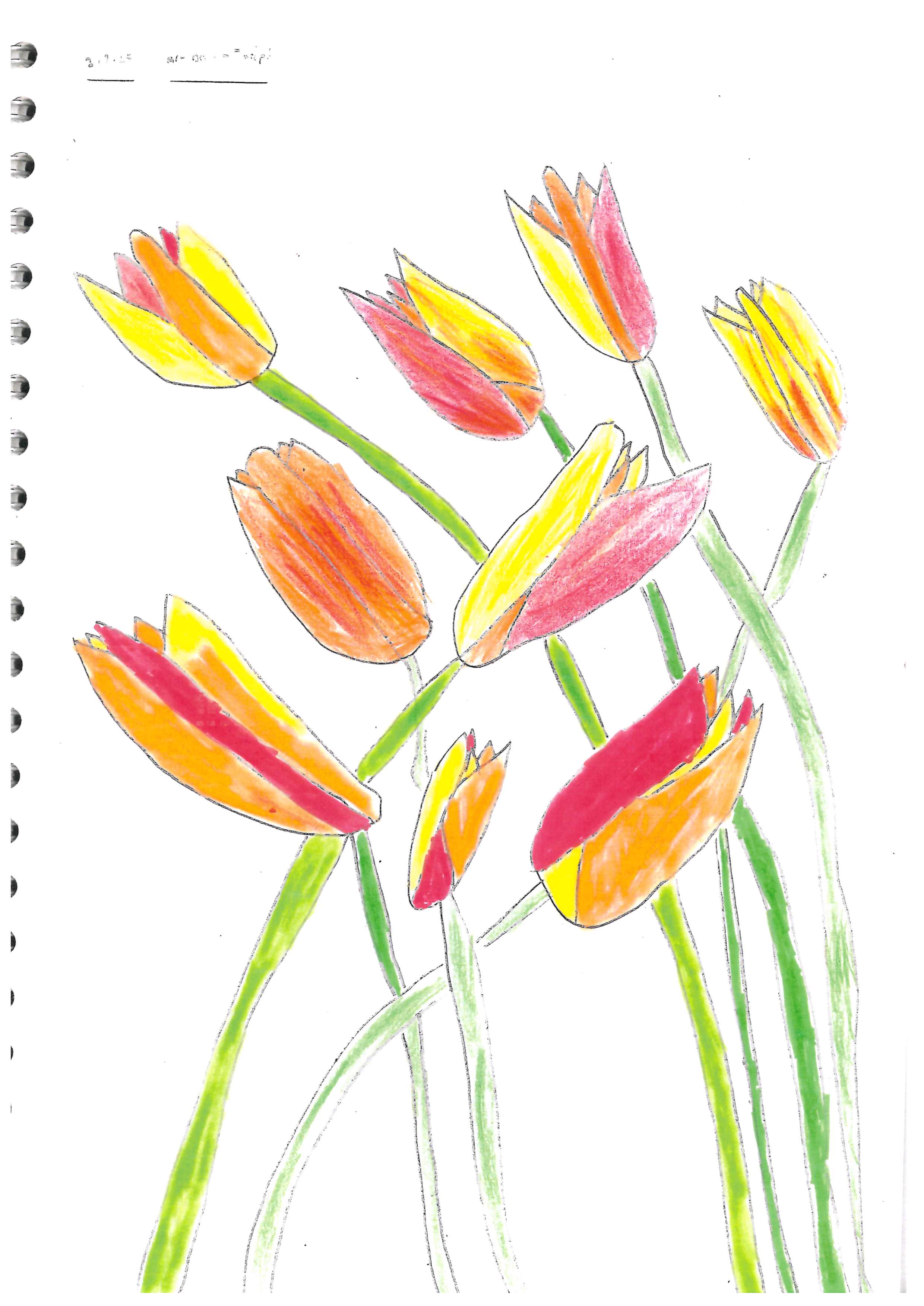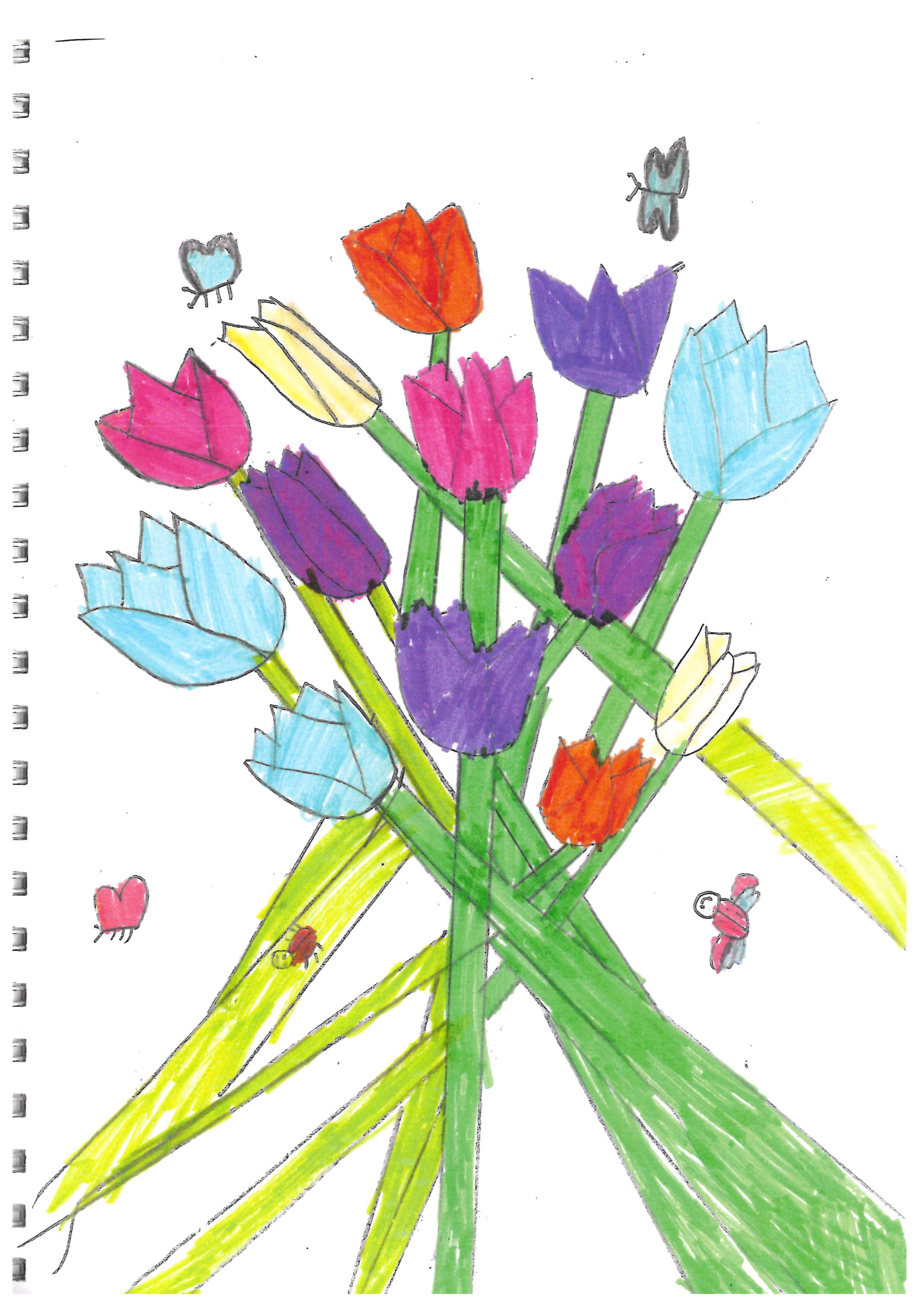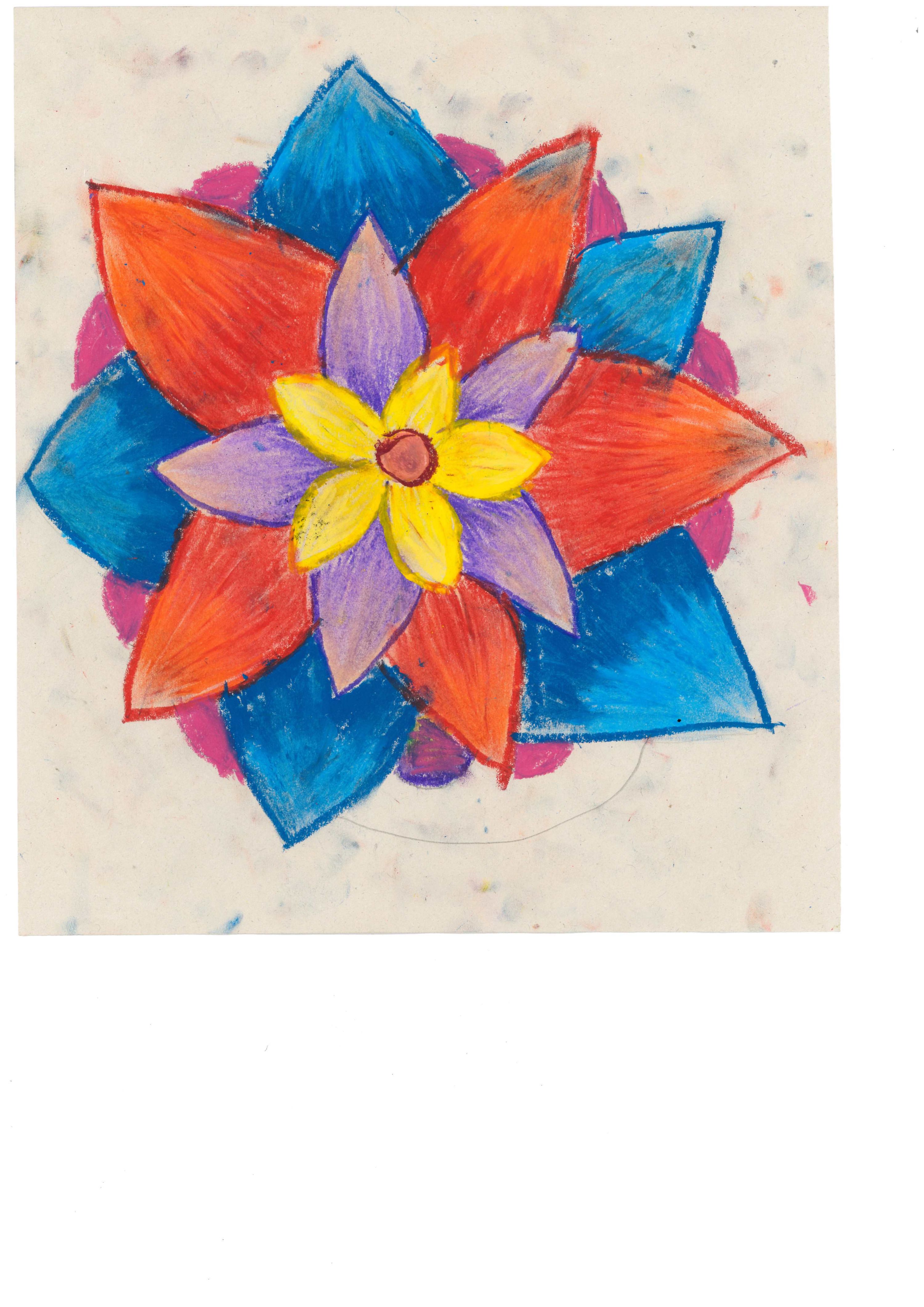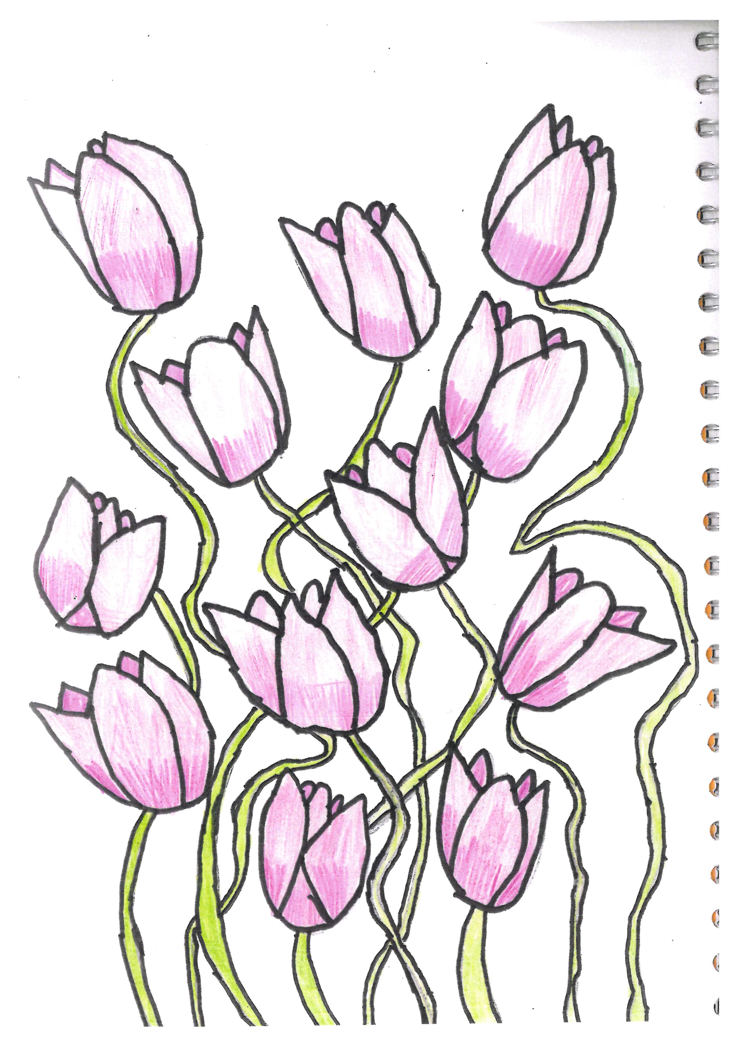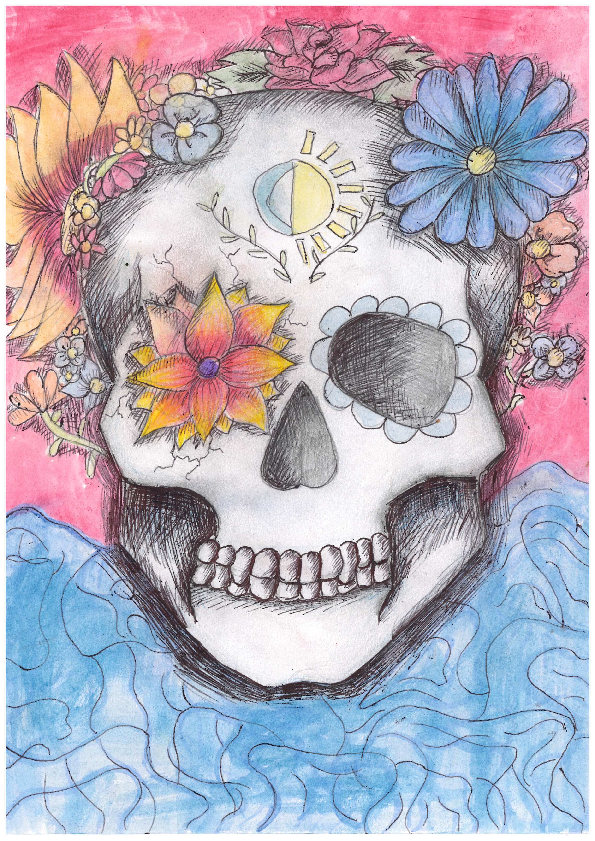 This is a vibrant piece demonstrating a controlled use of colour, texture and composition. The theme is represented in a striking way and the flowers are drawn with technical precision.