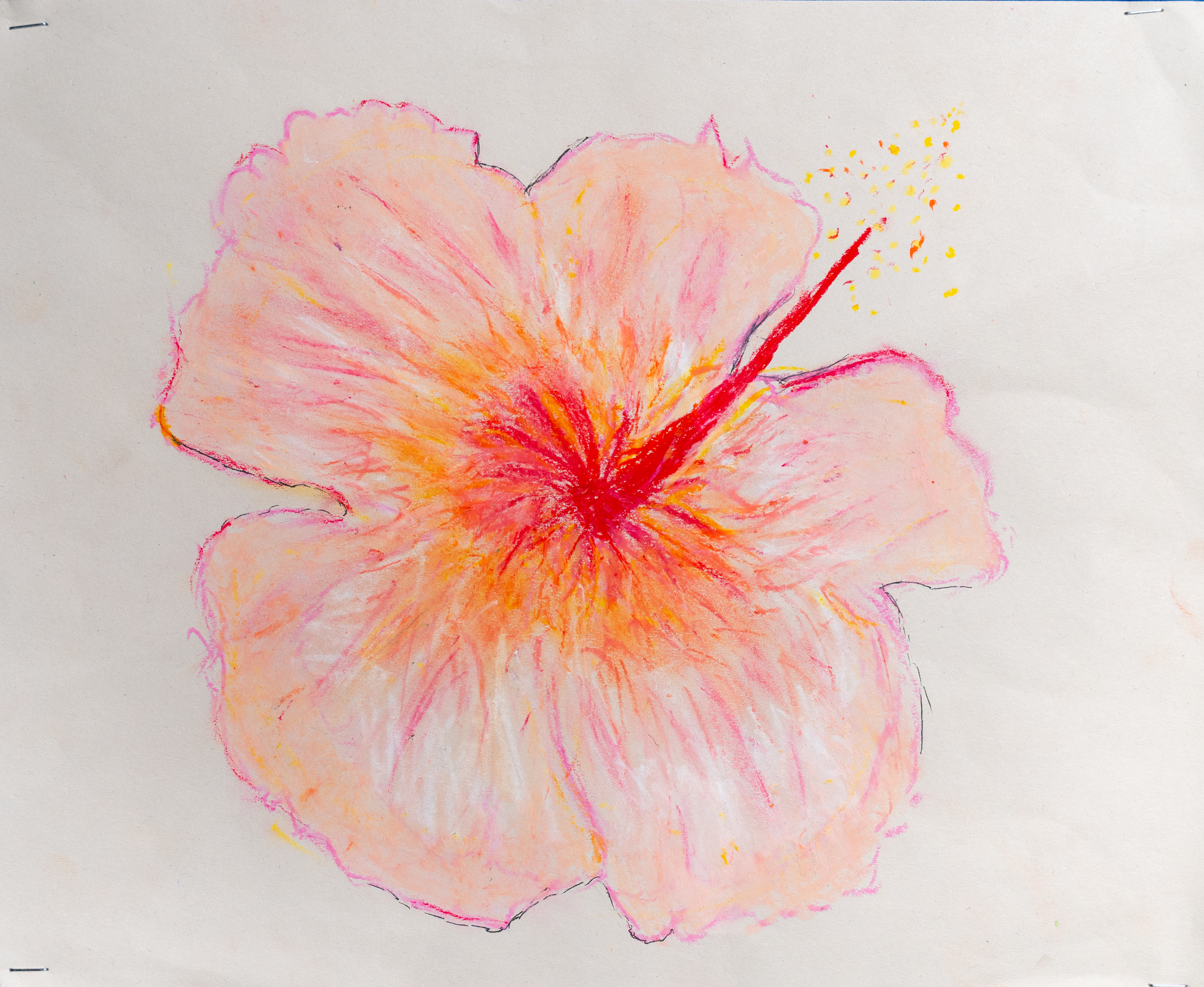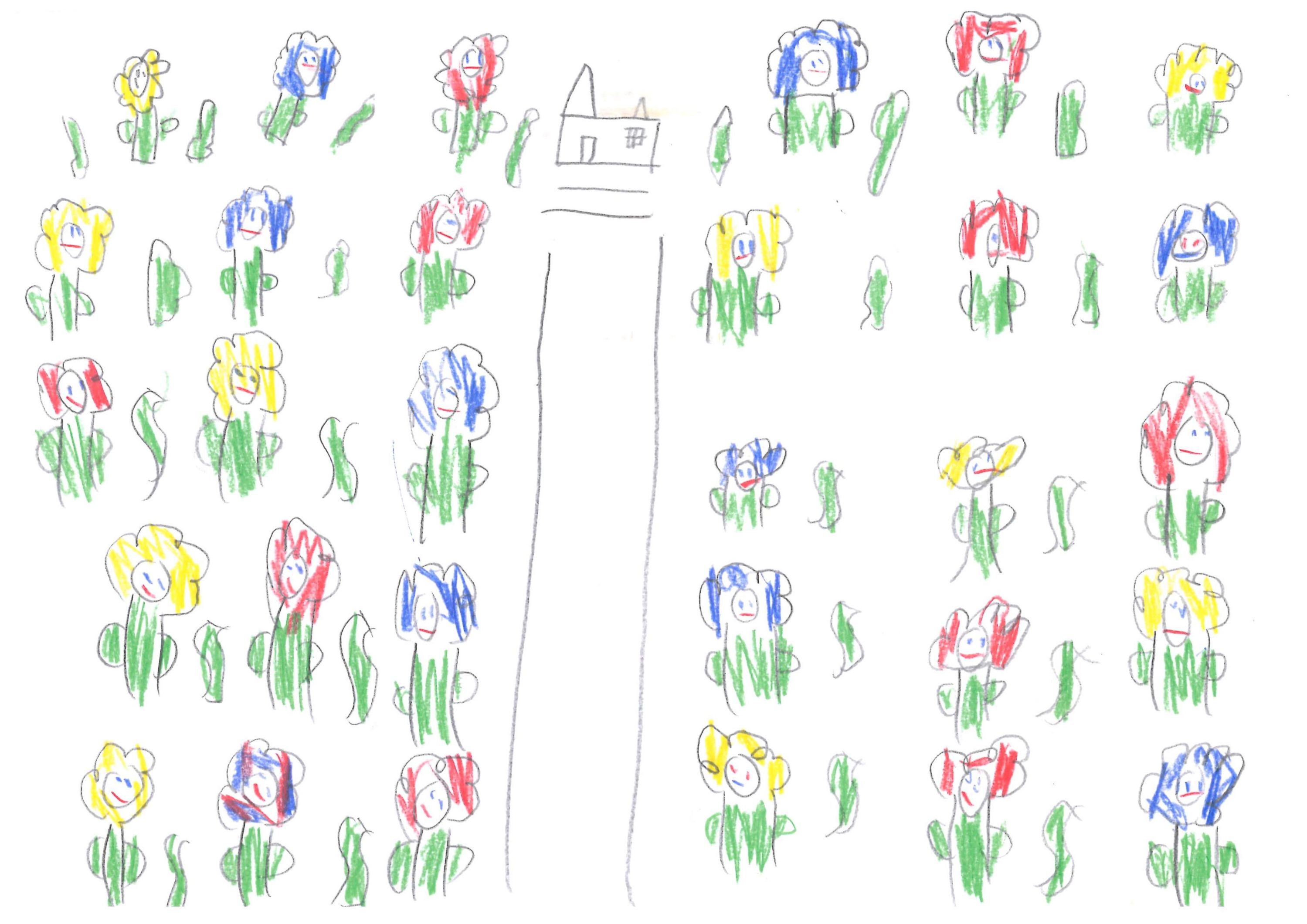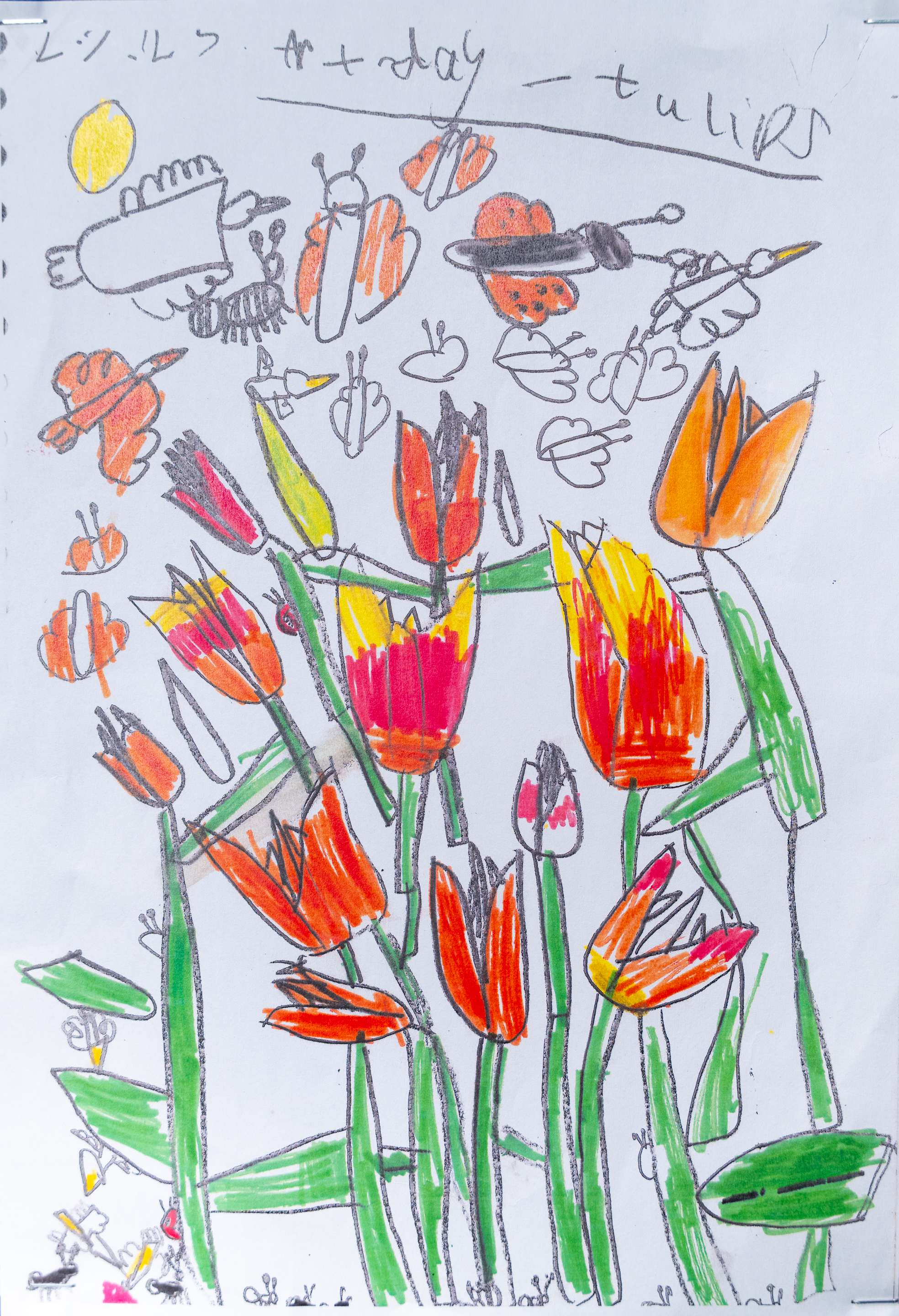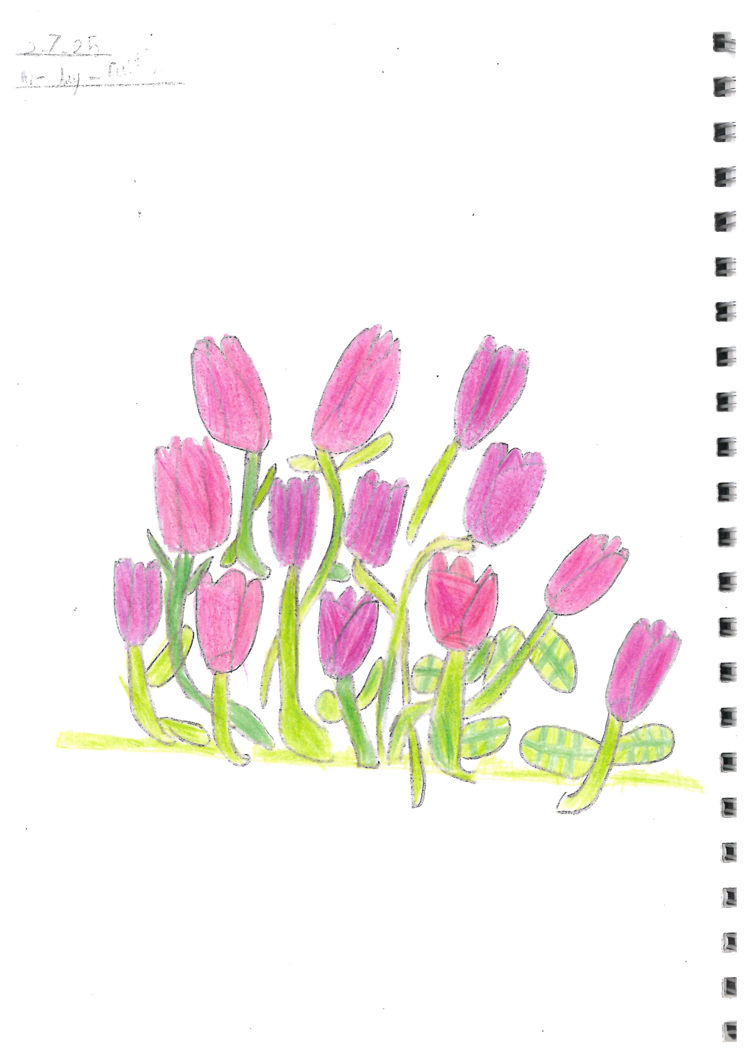This is a vibrant piece demonstrating a controlled use of colour, texture and composition. The theme is represented in a striking way and the flowers are drawn with technical precision.