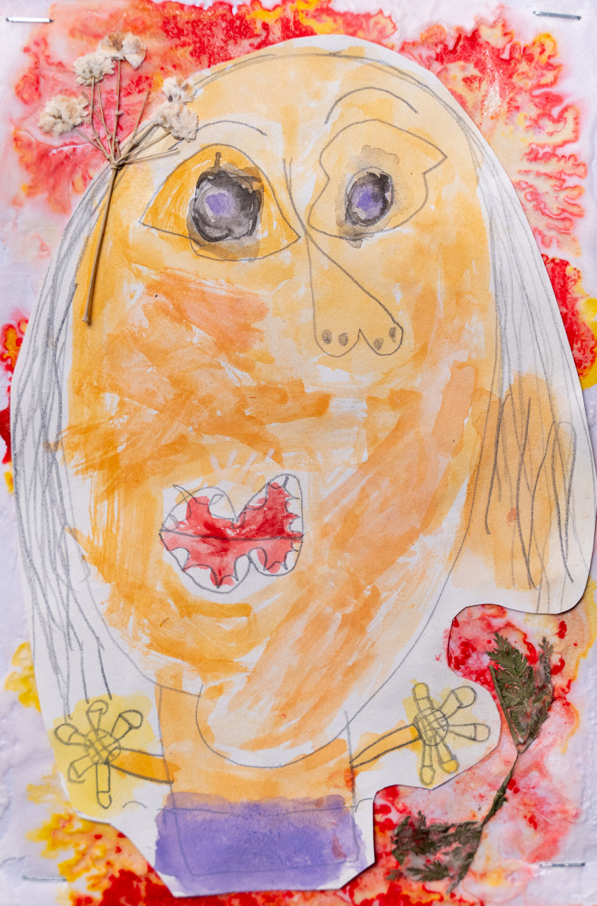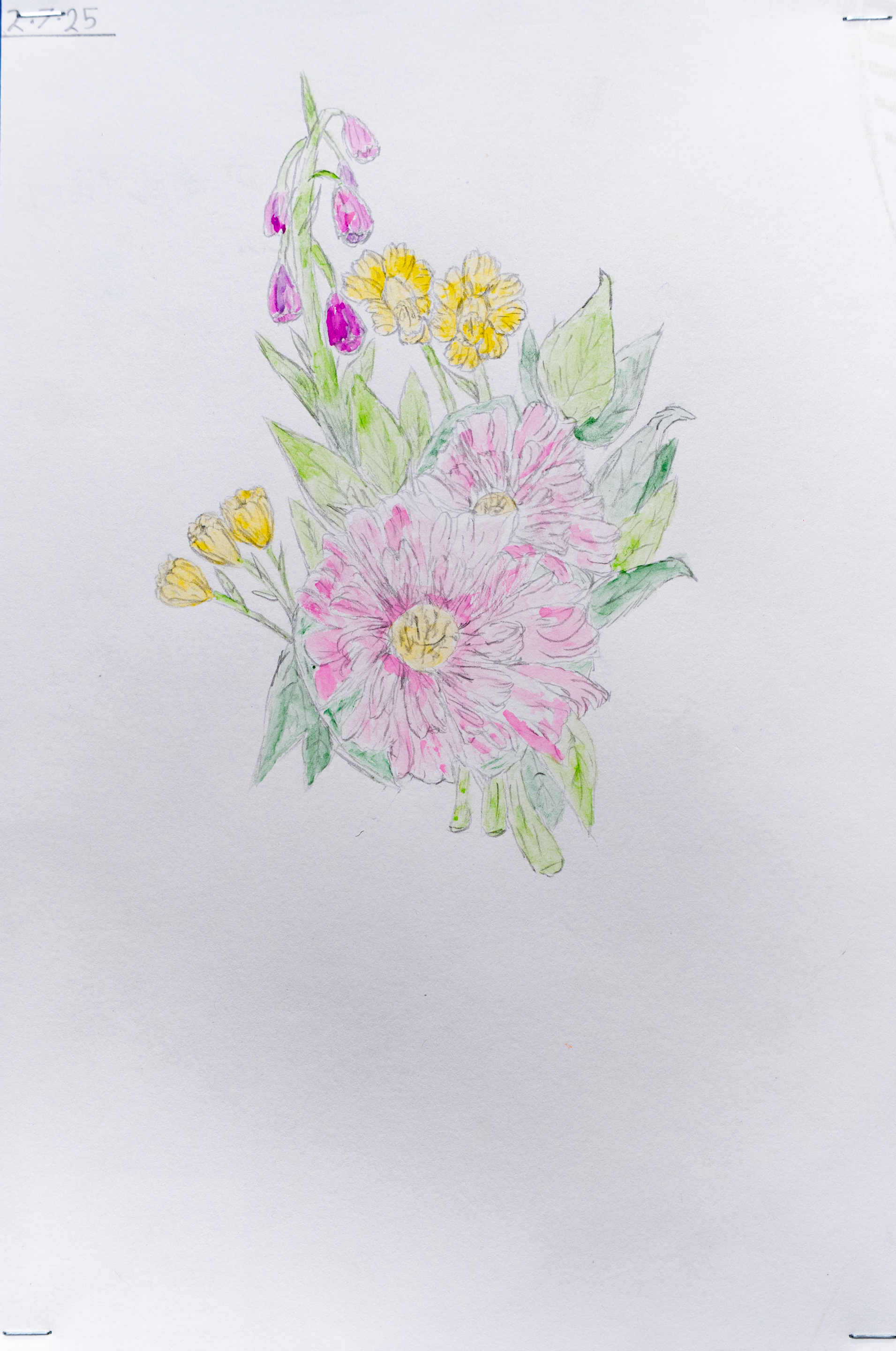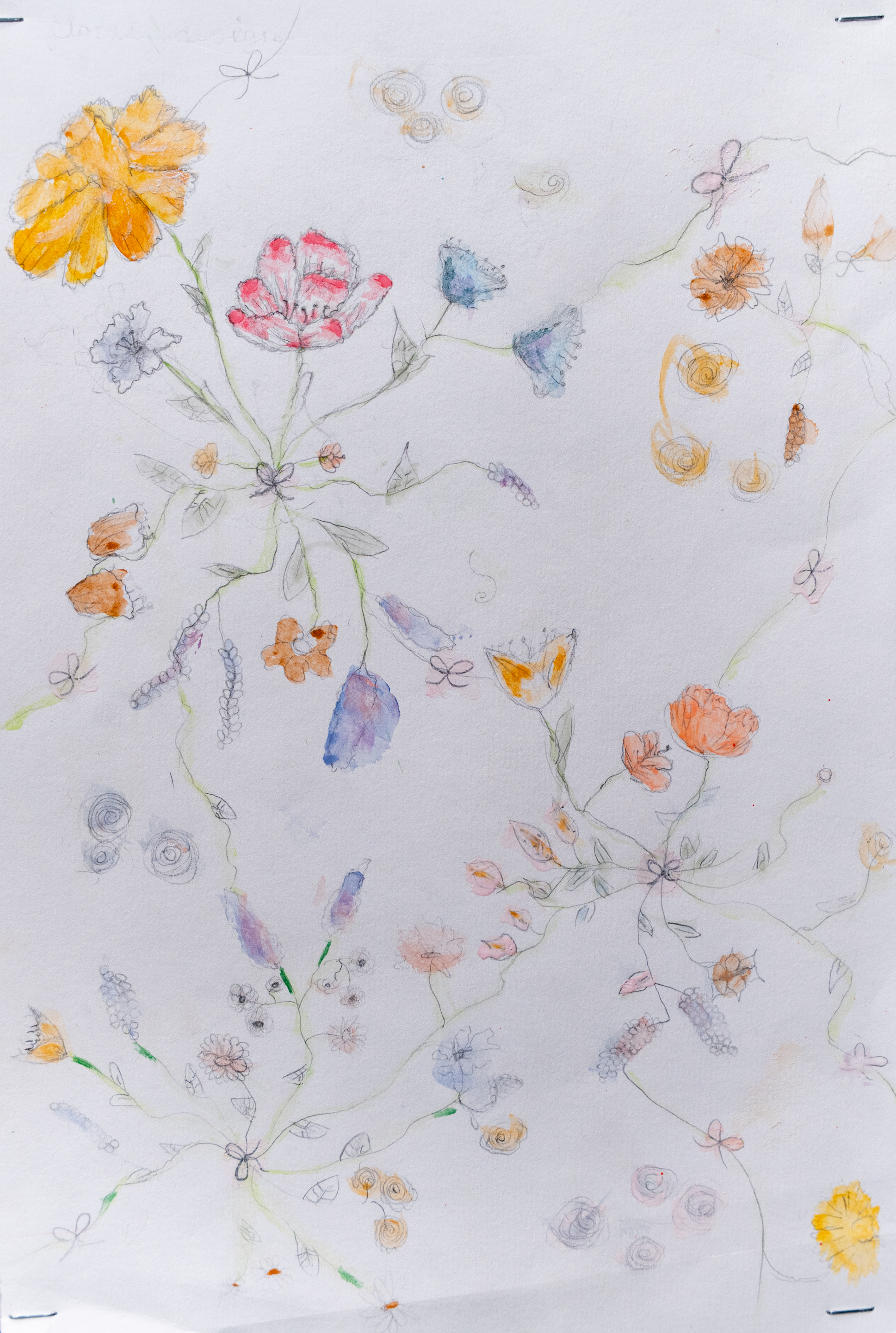 Delicate plants and flowers naturally meander across the page. Complimentary colours create contrast between loose watercolour washes and controlled pencil drawings, which creates a compelling piece.