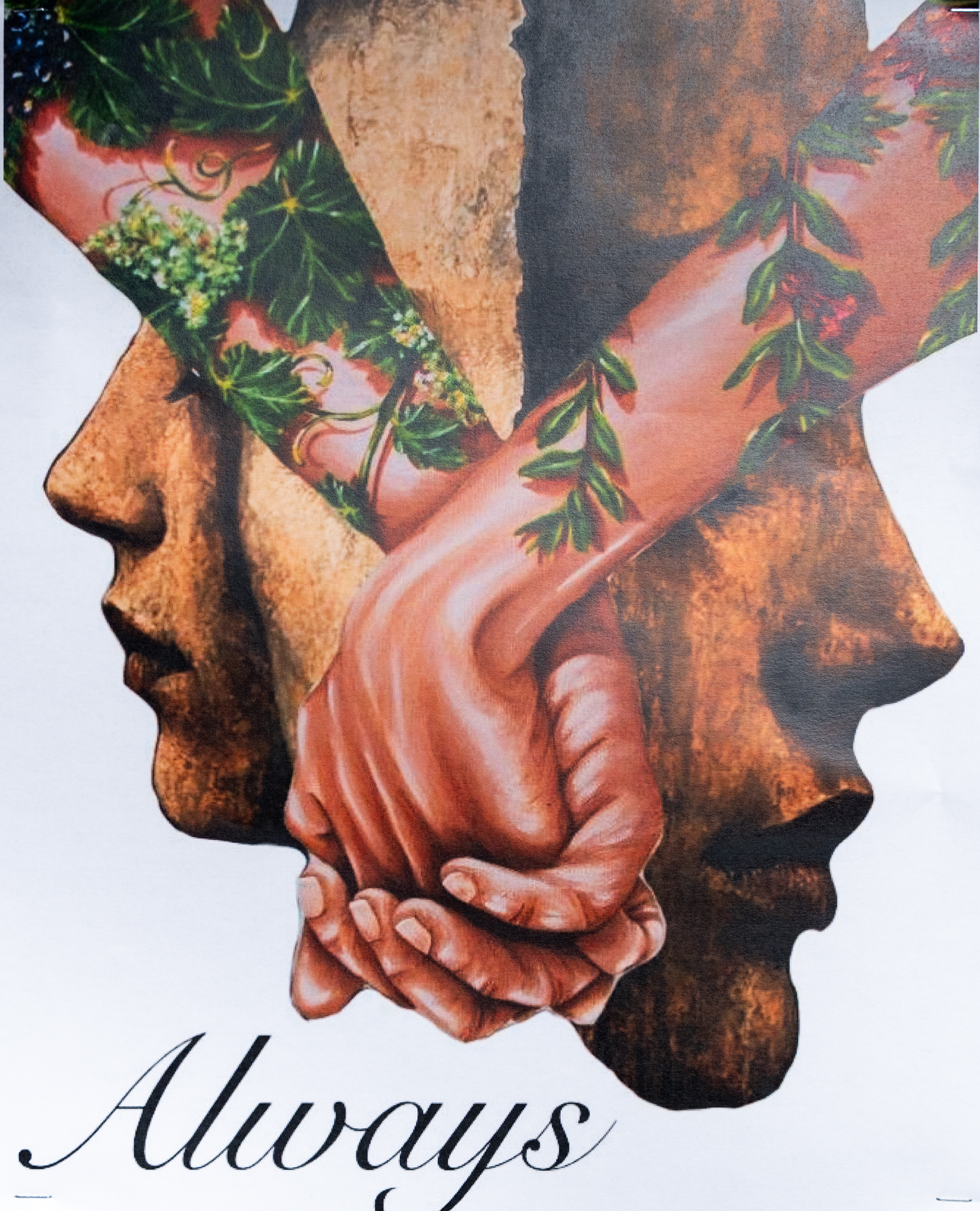 This piece particularly links to both themes of ‘flourishing’ and ‘togetherness’ in its composition. A bold piece, using layered elements and contrasting textures to create a striking graphic effect.